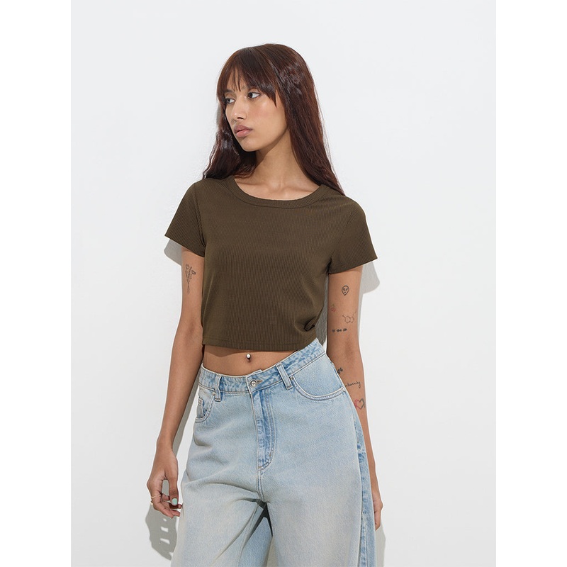 This dark olive crop t-shirt from Nuon features a striking cut-out detail at the back with sleek metal accents for a contemporary touch. Created from a ribbed-textured fabric, it offers a structured yet comfortable fit, complete with a classic round neck and short sleeves.