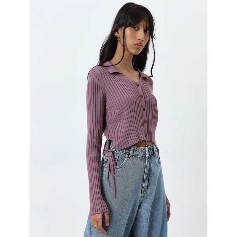 This mauve top from Nuon is designed with ribbed detailing. The soft and breathable fabric winter wear features a V-neck collar leading to a button-down style and full sleeves.