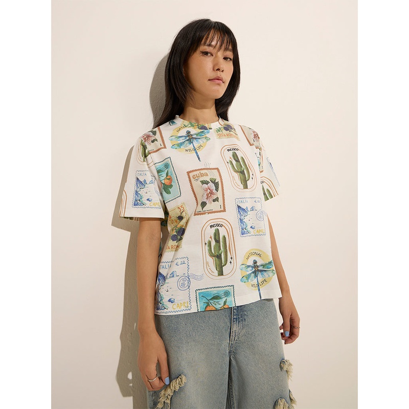 This off-white t-shirt by Nuon boasts vibrant stamp prints. The lightweight fabric garment carries a round neck and half sleeves.