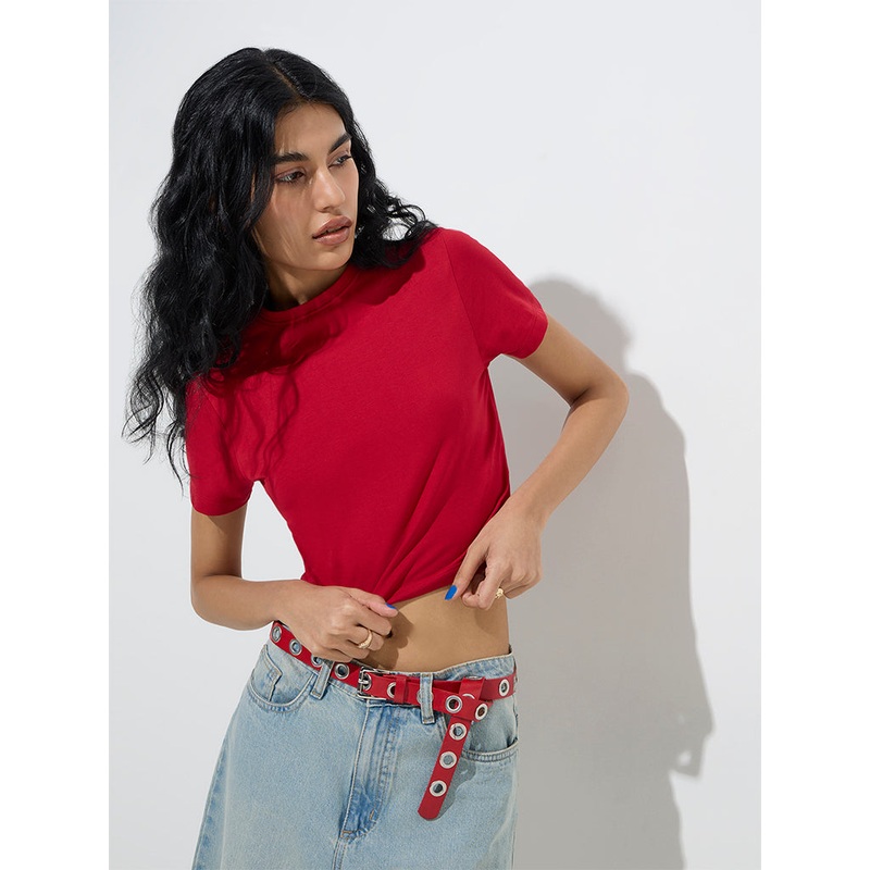 This red solid t-shirt by Nuon is made from a cotton-rich fabric and includes a round neck and short sleeves.