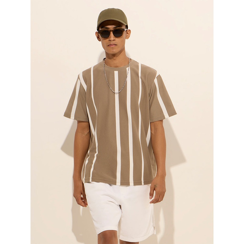 This taupe t-shirt from Nuon spotlights striped patterns. Milled from a cotton-blend fabric, the regular-fit garment includes a crewneck and short sleeves.