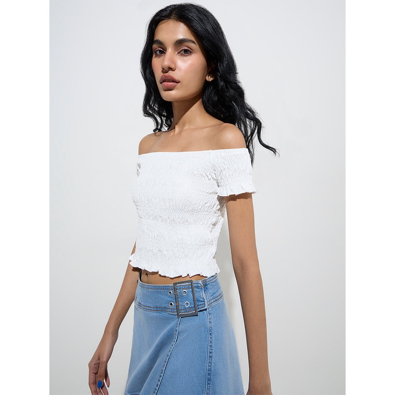 Nuon introduces this white crop top featuring a smocked bodice and ruffled trims. Spun from a lightweight fabric, it is complete with an off-shoulder neckline and half ruffled sleeves.
