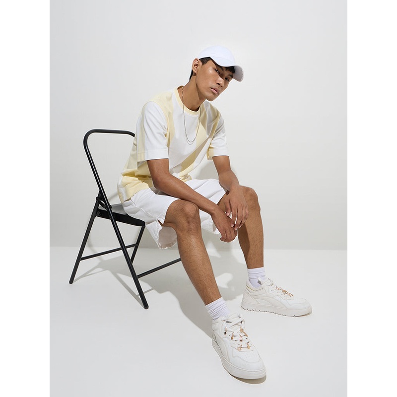 Brighten up your casual wardrobe with this yellow and white colour block T-shirt from Nuon. Crafted from a soft cotton-blend fabric, it features a regular fit with a round neck and half sleeves. The striking colour block design adds a fresh, modern touch to your everyday look.