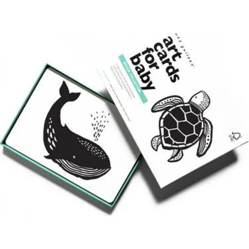 Babies are fascinated with black-and-white designs. Right from the start, these art cards begin developing a babys visual perception. The six adorable animals in this set include aCrab, Fish, Octopus, Seahorse, Turtle and Whale. Printed on sturdy board, these cards will stand up to baby’s explorations. Each 5″x7″ card is beautifully finished with matte lamination and child-friendly rounded corners.