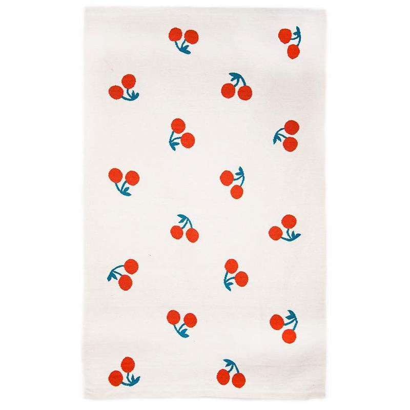 Sweet cherries on a 100% wool hand-loomed flat-weave rug. Made in Peru.Spot clean with a mild detergent.