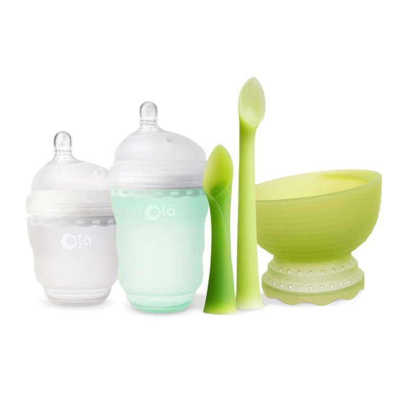 The Olababy feeding gift set provides the best feeding essentials from bottle feeding to the introduction of solids thru baby-led weaning. It includes a 4oz GentleBottle with slow-flow nipple, an 8oz GentleBottle with medium-flow nipple, a soft-tip parent feeding spoon, a baby-led weaning training spoon and a SteamBowl. All of these essential baby feeding products are designed to engage baby with enticing colors, easy-grip, and naturally inspired shapes. All products are made with 100% toxin free silicone that is BPA and phthalates free.