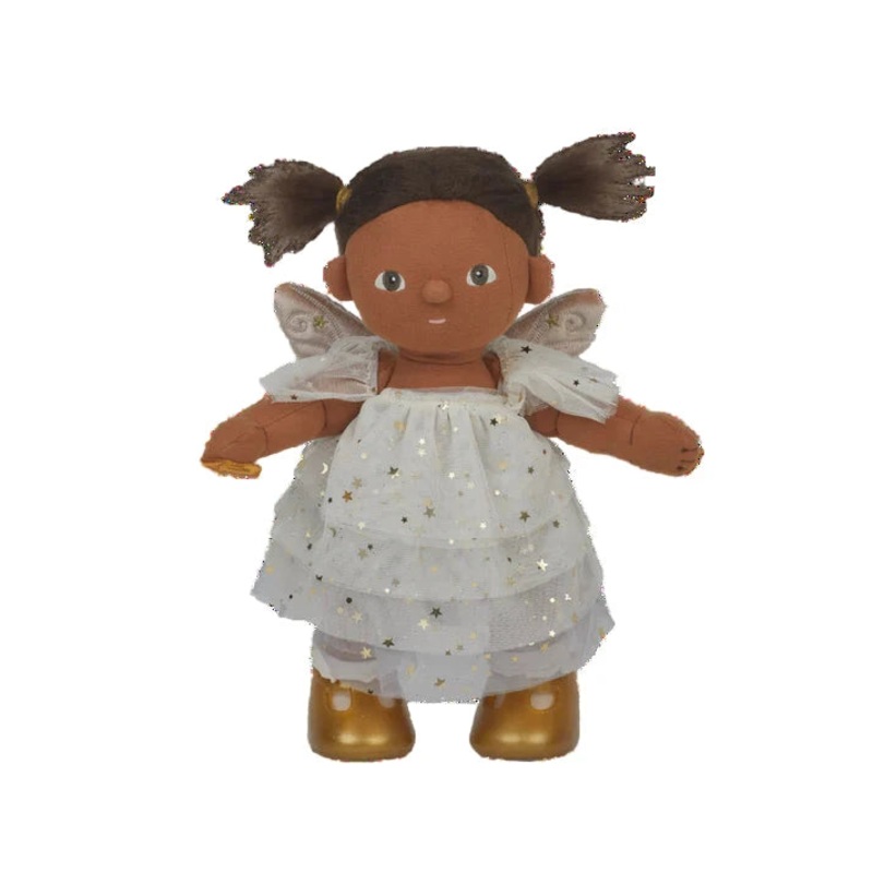She comes dressed in a removable sparkly tulle dress with fixed velvet embroidered wings, a sparkly star wand, frilly socks, cotton underwear and glittery shoes.