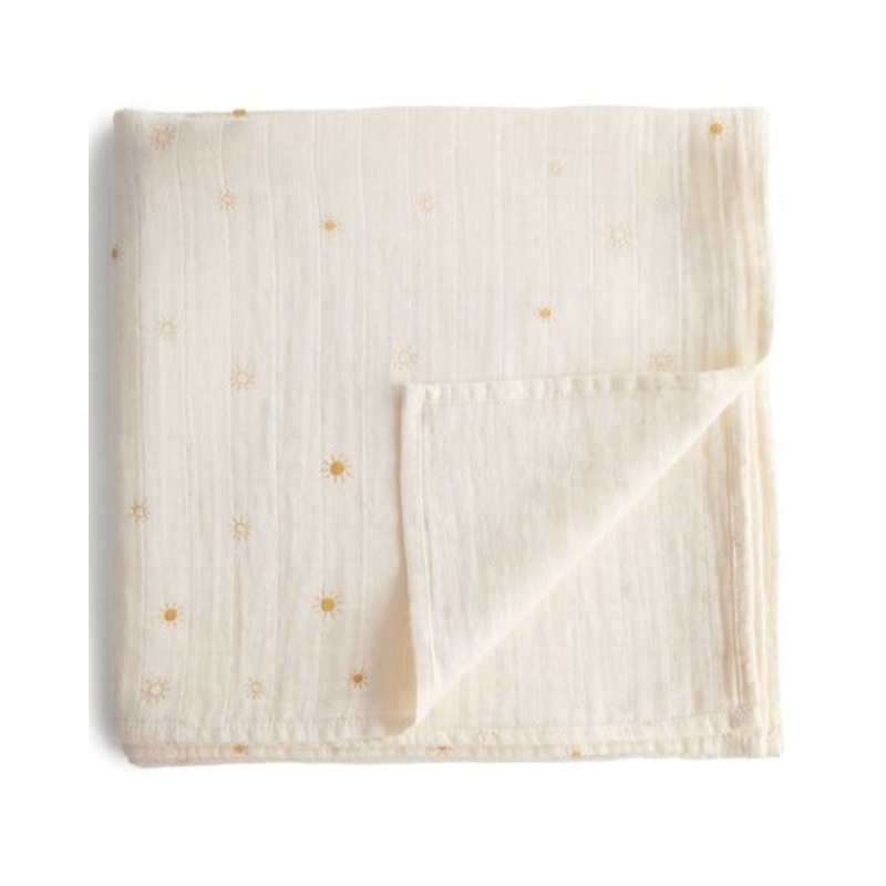 Daintybursts of suns cover this soft andbreathable muslin swaddle blanket. Lightweight and comforting, this swaddle will keep your newborn cozy and happy, which makes mama happy, too.