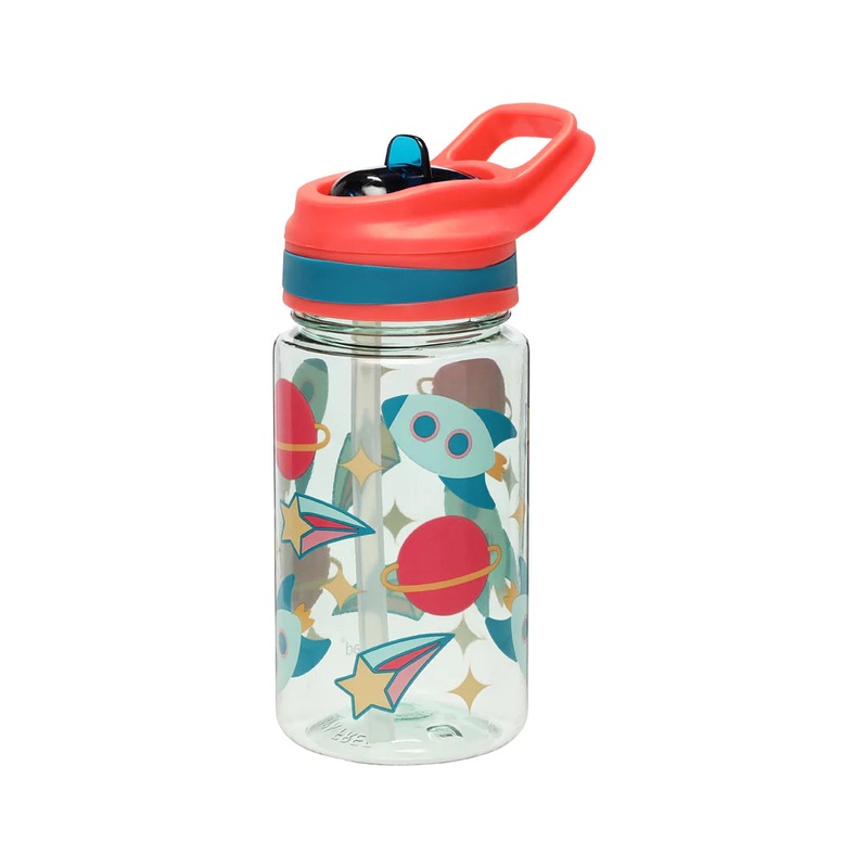 Includes one kids tritan water bottle with flip straw and adorable graphics of shooting stars, spaceships and planets childrens water bottle holds 16 fluid ounces, phthalate free, BPA free, dishwasher safe, for ages 3y+