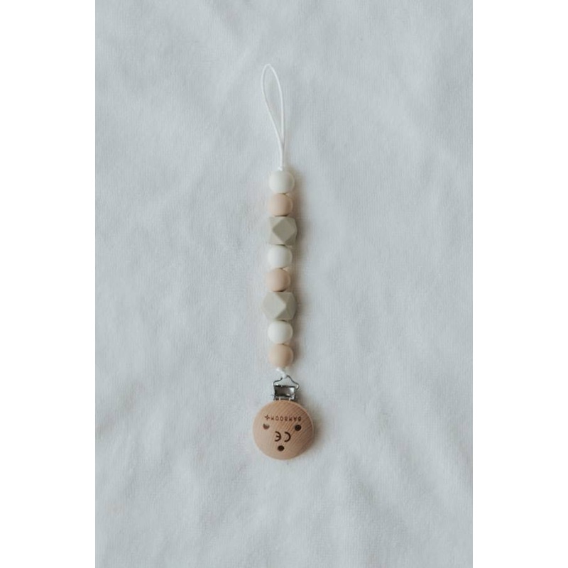 A stylish pacifier holder made of silicone: it comes with a handy wooden clip for hanging it on your baby's clothes and is made in neutral colors that allow you to easily match it with clothing!Code CBE0003