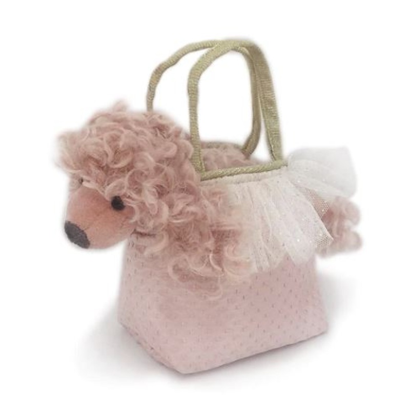 Tote around your pet bestie in their very own pretty toy purse! A miniature Paris the Poodle comes in a beautiful pink satin bag, trimmed in soft glitter tulle and gold handle.