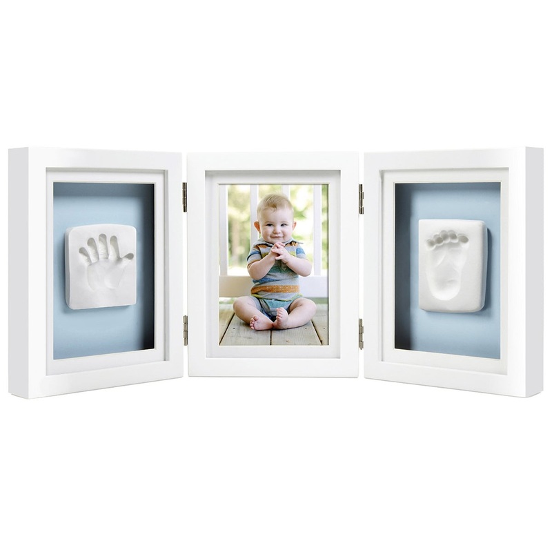 The deluxe version of our Babyprints Desktop Frame, this classic white shadowbox frame has three panels to display both your baby’s handprint, footprint, and photo. Everything is included to make your keepsake. Just press their tiny hand and foot into the non-toxic, soft air-drying clay to capture the precious imprint, and place in the frame. Includes a reversible pink and blue background board, and beveled mat to display an adorable little photo. This keepsake makes a big impression, yet is compact enough to easily fit on a desk in your home or office.
