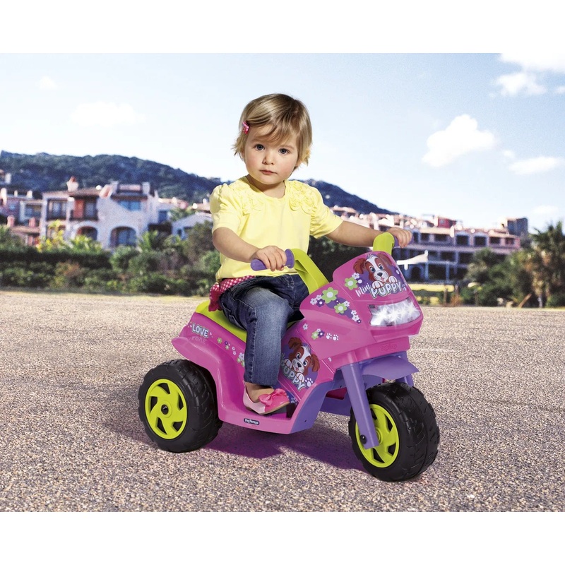 Powered by a 6-volt rechargeable battery, the Mini Puppy offers up to 95 minutes of continuous play with a top speed of around 3 mph. It includes an electronic dashboard with a START button and battery status indicator. The large, anti-slip footrest has both the accelerator and brake under a single pedal for easy control. The bike is easy to steer, thanks to the wide turning range and easy-grip handlebars.
