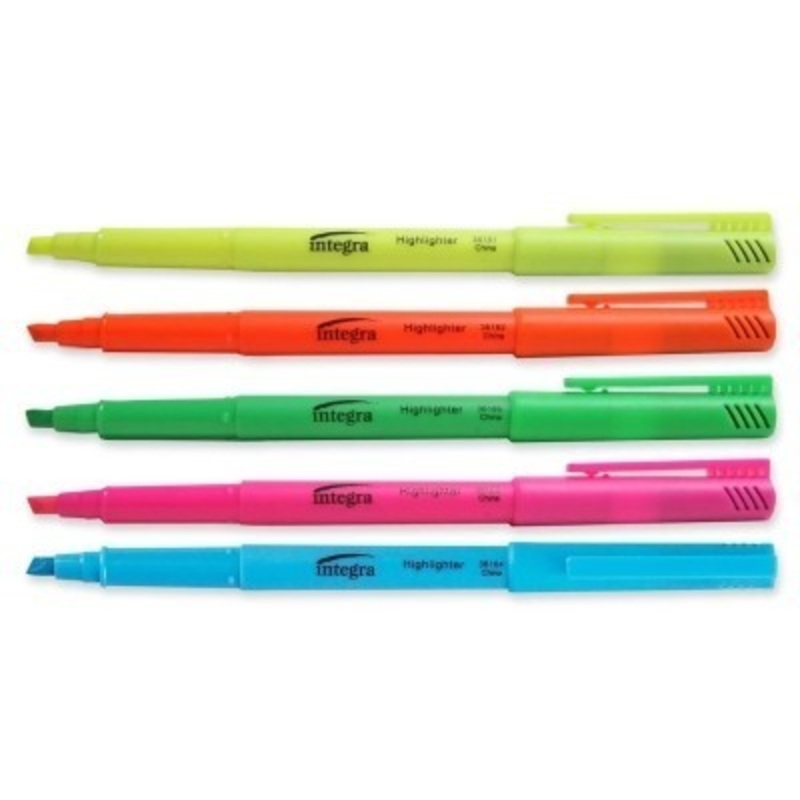 Pack of 5 assorted color highlighters.Features the pen-style with fluorescent ink.Chisel tip makes wide or narrow lines.Quick-drying and odorless.