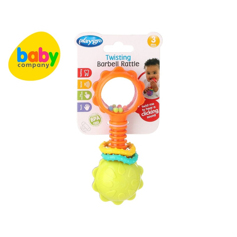 Recommended for ages 3 months and up Twist to hear a clicking sounds Measures approximately 2.5 x 5.5 inches