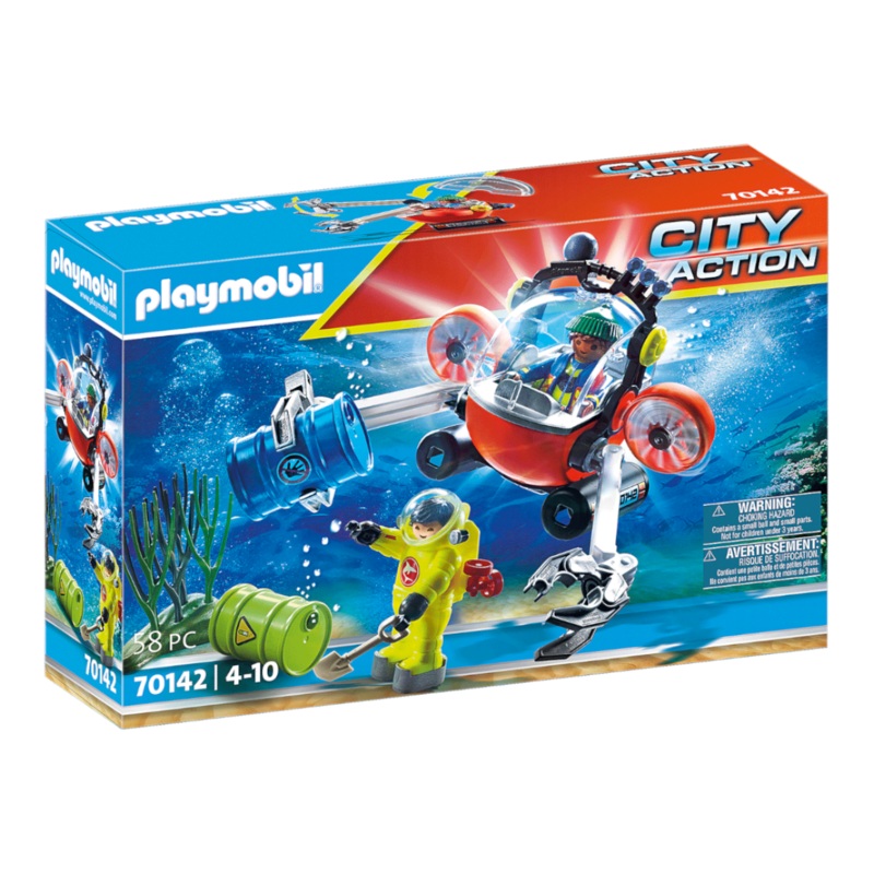 Two divers have discovered tons of dangerous contents on the sea floor, which urgently need to be salvaged. The researchers are using their mobile diving robot for this difficult mission. Slowly they approach the two barrels and pick them up with their gripper arms. Now the hazardous material is carefully transported to the surface and then disposed of. The playset consists of two PLAYMOBIL figures, a diving robot with movable gripper arms, a deep-sea diving suit, two tons, shovel and many other extras. The diving robot can swim and dive.