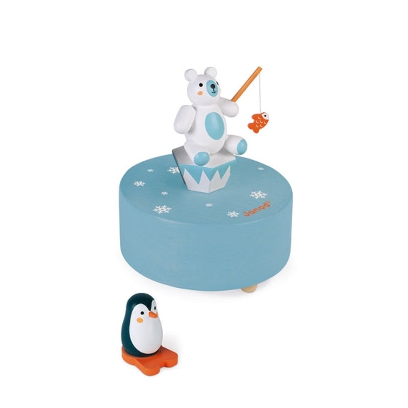 Wind the key and watch the penguin spin on a spring around the ice fishing polar bear to the tune of Lightly Row!