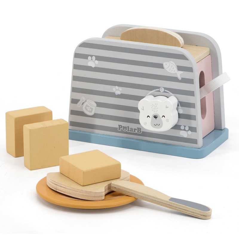 Our PolarB Toaster painted in soft contemporary colours of light grey and white is perfect for the contemporary play kitchen.This wooden set contains a two-slice toaster that makes clicking sounds when the dial is turned, two slices of toast, three pieces