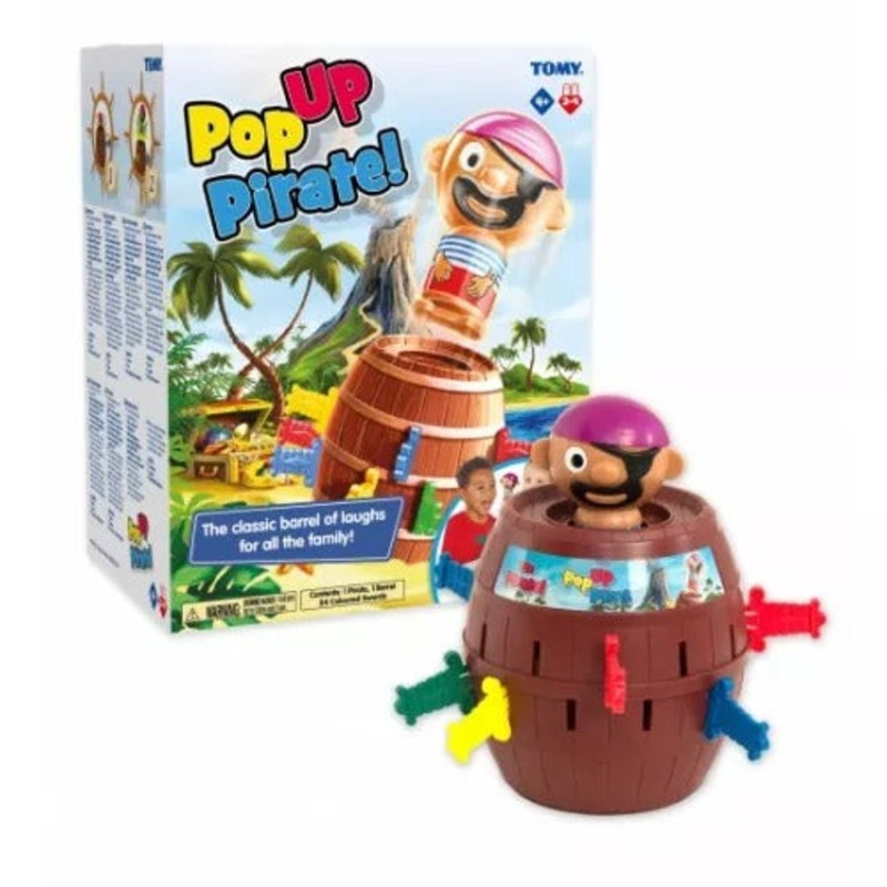 Welcome aboard, me hearties! Pop-up Pirate is the classic action game thats a barrel of fun! Players take turns to carefully slide their coloured swords into the barrel If you send Pirate Pete flying, youre out of the game. Last surviving pirate wins the game.
