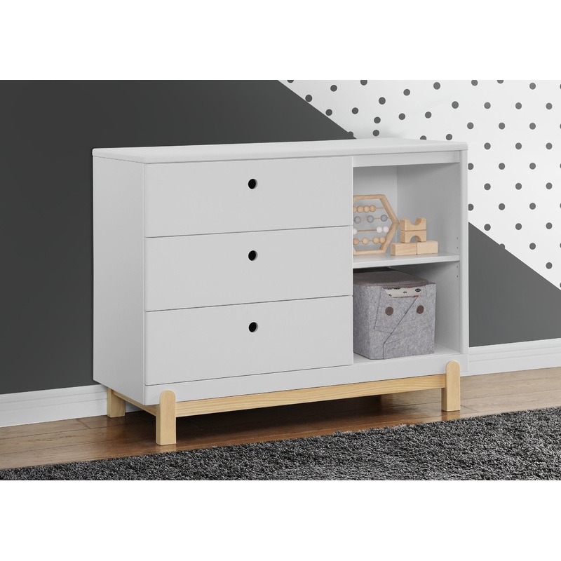Bring style and convenient storage to your little one’s bedroom with the Poppy 3 Drawer Dresser with Cubbies by Delta Children. This wood dresser features three drawers to keep shirts, pants and socks, while the other side features two open cubbies to house books, bins or toys. Modern and playful, this versatile dresser features a natural wood base and feet paired with a contrasting finish on top for a look that works from baby to big-kid. To complete your childs bedroom, pair the Poppy 3 Drawer Dresser with Cubbies with the Poppy 4-in-1 Convertible Crib by Delta Children. Dresser is available in Bianca White with Natural, Grey with Natural and Midnight Grey with Natural.