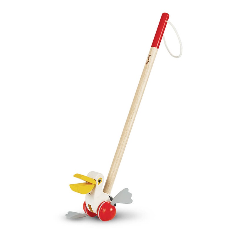 When pushed, this pelican makes a clattering sound with its mouth and a flip-flop sound with its feet. The pelicans feet are made from natural rubber and can be washed to keep clean. This toy helps develop fine and gross motor skills while children also practice walking on their own two feet.