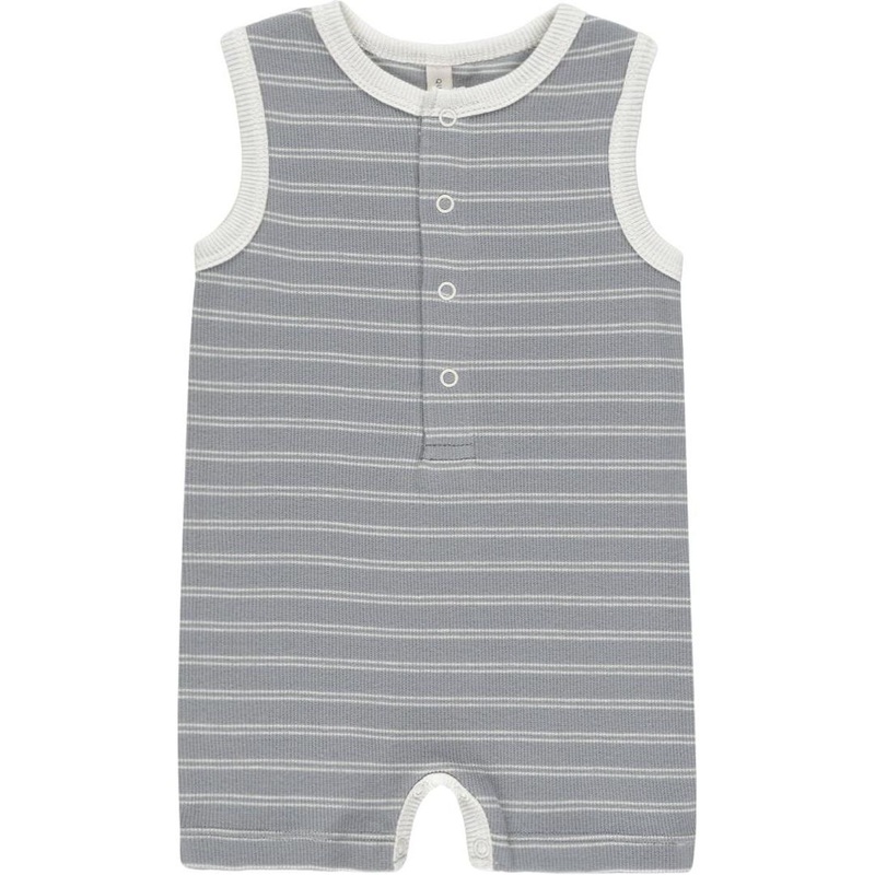 This ribbed romper is an easy lightweight look for summer. Designed with buttons down the chest and inseam for easy changes.