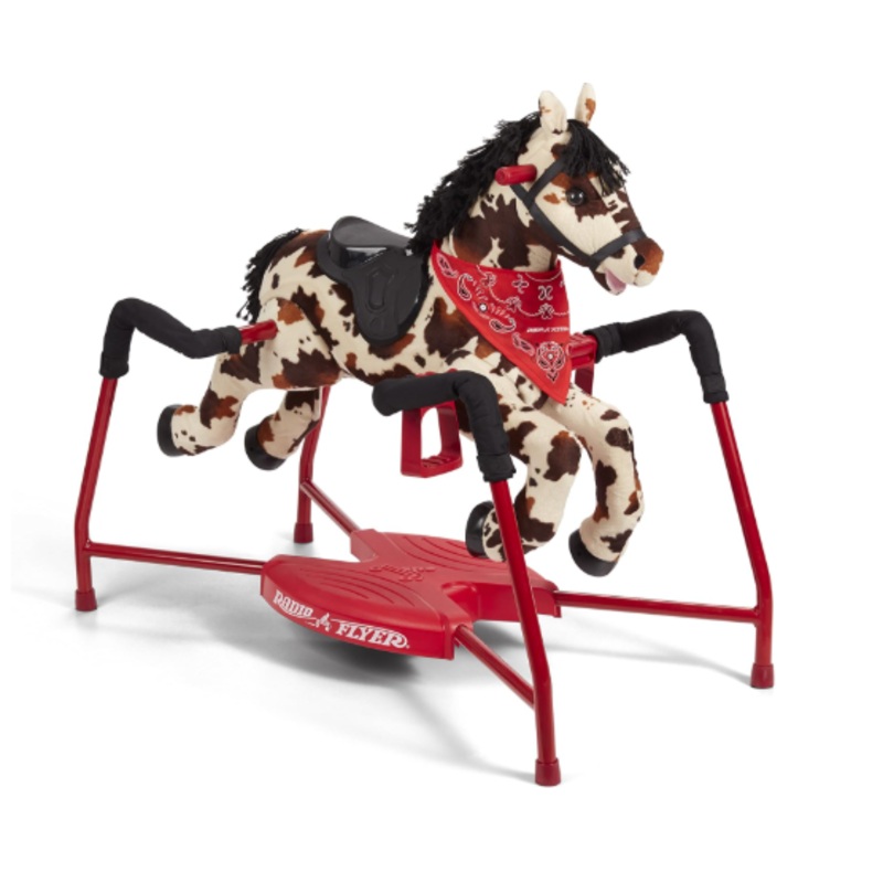 Introduce your child to the world of horseback riding. With 3 levels of riding – walk, trot, gallop – this toy triggers realistic riding sounds that change as you go faster. The deluxe fabric adds comfort and durability, while the carrot accessory activates chewing sounds for imaginative play. Spring covers and EZ Climb step ensure safety for toddlers and kids aged 2-6.
