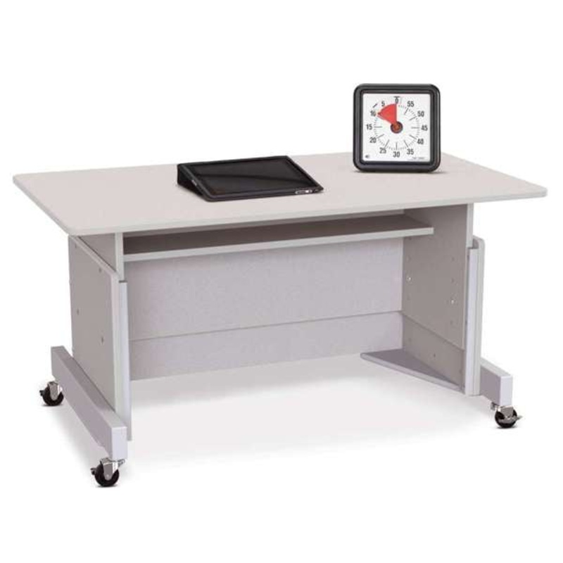 This desk can be adjusted in two-inch increments accommodating pre-school students through adults. Grommet and fully enclosed back help hide unsightly cords and wires. Storage shelf under easy to clean laminate top provides space for computer accessories. Constructed of double-sided freckled gray laminate with gray TRUEdge.KYDZSafe edges. KYDZStrong construction. TRUEdge. Choose from multiple tabletop and TRUEdge color combinations. Heavy-duty, locking casters for mobility. Grommet for cords. Triangular gussets for added strength. GREENGUARD Gold certified. CARB II & CPSIA compliant..