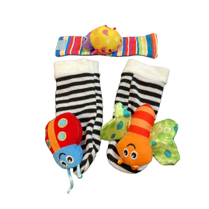 “Put these on your baby’s hands or feet and watch them be delighted when the animal rattles as they move.”