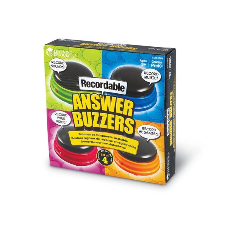 Come up with your own fun buzzer sounds! Record silly messages, words, sounds, or musicthe possibilities are endless! Record up to 7 seconds per buzzer. Just tap, record, tap, and listen!Includes recordable buzzers in 4 different colors and Activity Guide.