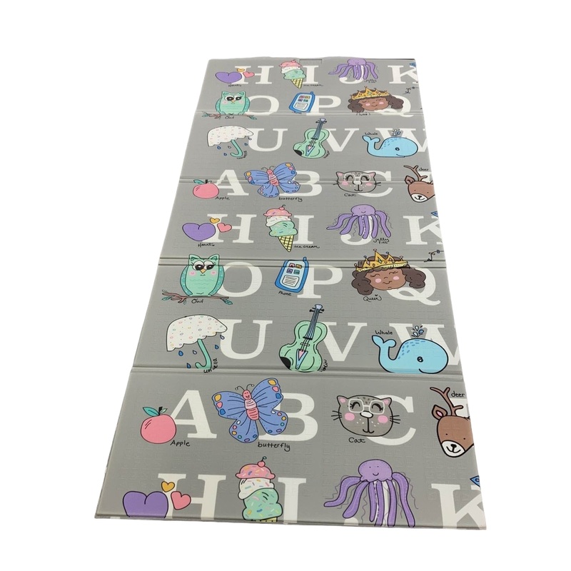 “This 70 x 71 foam play mat is a soft place for playtime. It is reversible, easy to clean, foldable and colorful!”