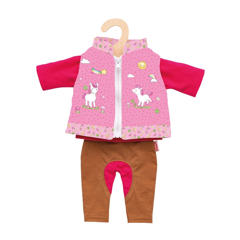Das entzckende Reiter-Outfit “Lina” von Heless ist ein 3-teiliges Set, bestehend aus Hose, Shirt und Weste. Die Weste ist mit einem niedlichen Einhorn-Print versehen und wattiert, was sie besonders kuschelig macht. Hergestellt aus weichem und elastischem Jersey-Material, bietet das Outfit optimalen Tragekomfort fr Puppen der Gre 28-35 cm.Die Weste verfgt ber einen leichtgngigen Reiverschluss, der das An- und Ausziehen kinderleicht macht. Zudem ist sie mit einem sen Allover-Print versehen, der das kleine Pferdchen “Lina” zeigt, das frhlich ber die Koppel springt. Umringt von niedlichen Elementen wie Kleeblttern, Blmchen und Wlkchen, ist die Weste ein echter Blickfang.Das Set beinhaltet auch ein weiches Jersey-Shirt in krftigem Pink, das durch einen Klettverschluss im Rcken einfach an- und ausgezogen werden kann. Die Puppen-Reithose berzeugt durch ihr klassisches Design und den elastischen Jersey-Stoff, der fr eine gute Passform sorgt. Das Outfit ist fr die meisten Puppen der Gre 28-35 cm geeignet.Die Altersempfehlung fr das Reiter-Outfit “Lina” liegt bei Kindern ab 3 Jahren. Die Weste besteht aus 65 % Polyester und 35 % Baumwolle, whrend Shirt und Hose aus 95 % Baumwolle und 5 % Elasthan gefertigt sind. Geliefert wird das Produkt auf einem praktischen Holzkleiderbgel, der die Aufbewahrung erleichtert.Insgesamt ist das Reiter-Outfit “Lina” eine tolle Ergnzung fr die Puppengarderobe und lsst die Herzen aller Pferdeliebhaber hherschlagen. Mit seinem niedlichen Design und dem hohen Tragekomfort ist es ein Must-Have fr kleine Puppenmamas und -Papas.