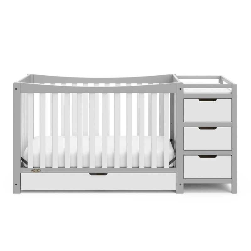 The clean lines and airy slatted design of the Graco Remi 4-in-1 Convertible Crib with Drawer and Changer make a sweet, modern addition to your nursery. The space-saving, full-size crib with storage drawer and includes an attached changing table with 3 concealed drawers and 2 open shelves to make this all-in-one crib as convenient as it is charming. In addition to its 3 drawers 2 two open shelves, the attached changing table includes a water-resistant vinyl changing pad and safety strap.