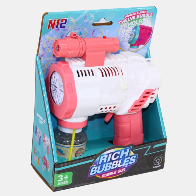 Bring endless fun to playtime with thisRich Bubbles Bubble Gun! Designed with a Gatling-style blower, built-in LED flashlight, and electric punch action, this bubble blaster creates a magical bubble-filled experience for kids.High-output bubble blower Prod