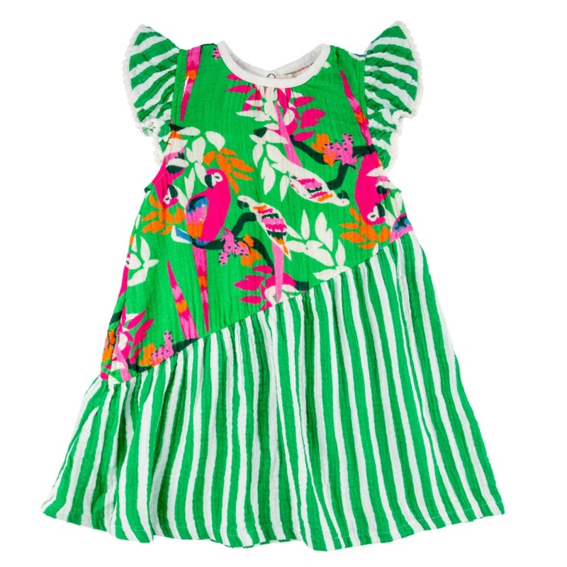 With bright, bold colors, Miki Miette’s Lia dress in their Rio pattern is sure to impress your little one. This dress features asymmetrical stripes, ruffle sleeves, and a few fun parrots. It’s a great dress for any activity from school to Saturday play dates.