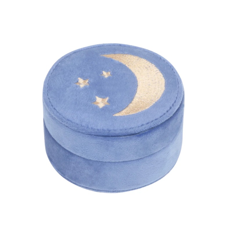 Featuring a a beautiful embroidered moon and stars,this jewellery box opensto reveal a compartment, a slip pocket and a dedicated space to slot earrings and rings. Fully lined in the most beautiful navy jersey fabricwith scattered gold foil stars.