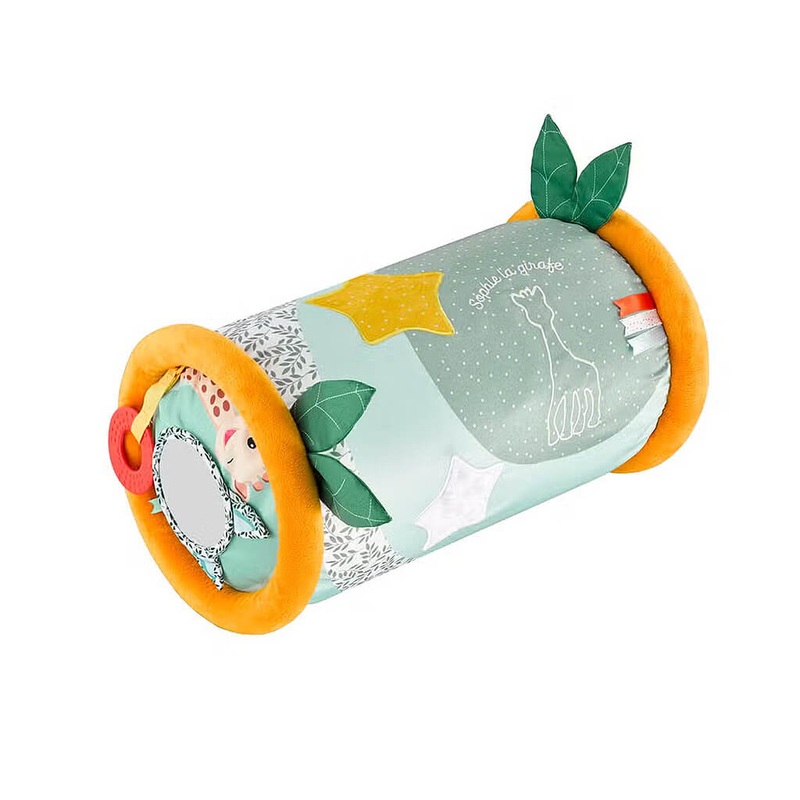 A roller to climb, roll, and sit astride, and to develop Baby's motor skills and balance. The Inflatable Structure covered with fabric provides comfort softness and Security.A mirror and black/white contrast to boost sightSound balls inside the roller to b