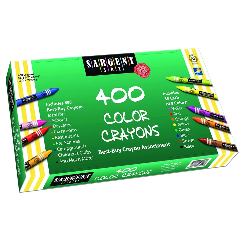 Filled with value and 8 basic colors, these Sargent crayons are packaged for easy use and convenient classroom storage.400 count50 each of 8 colorsEach crayon measure 3 5/8" x 5/16"