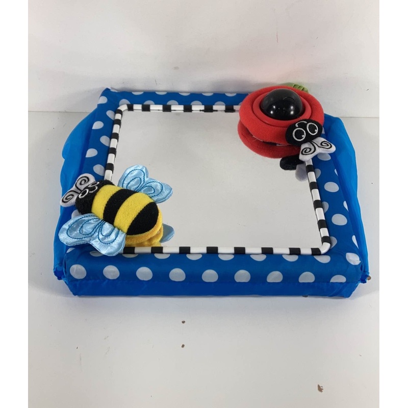 “This little mirror will keep your baby engaged as they explore their own face. The mirror props up on a soft self standing easel to take anywhere. “