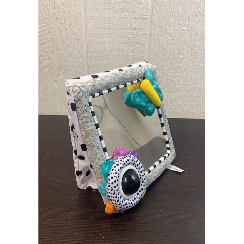 “This little mirror will keep your baby engaged as they explore their own face. The mirror props up on a soft self standing easel to take anywhere.”