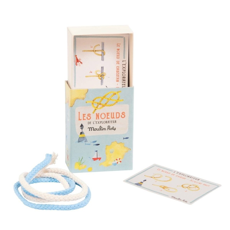 Seemannsknoten-Set von Moulin Roty. Die Schachtel enthlt zwei Schnre und bebilderte Anleitungskarten. Kleine Matrosen lernen so ihre ersten Seemannsknoten.Schult spielerisch die Feinmotorik und die Hand-Augen Koordination.Modell: MR712369Alter: 3+ JahreGre