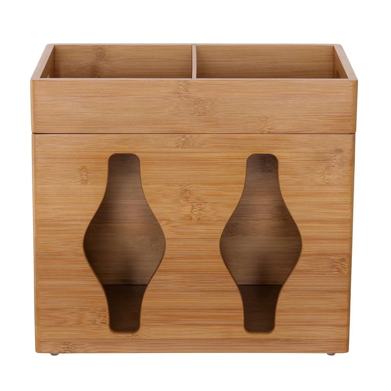 Seville Classics Bamboo Plastic Bag Organizer Elevate your home organization with the Seville Classics Bamboo Plastic Bag Organizer. Crafted from sustainable bamboo this organizer embodies the perfect blend of functionality and natural beauty. Say goodbye to unsightly plastic bags strewn about and embrace a clutter-free environmentally friendly space. Its thoughtfully designed compartments ensure easy access and tidy storage. Handles make the top tray easy to carry and can be used as a convenient grab-and-go cleaning caddy. This organizer can also be used as a snack dispenser in the pantry.