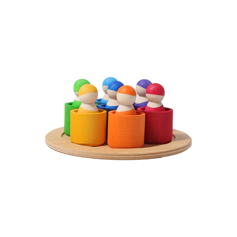 Die sieben Freunde im Holzschlchen von Grimms sind ein wundervolles Spielzeug, welches Ihr Kind eine lange Zeit begleiten wird.Am Anfang wird es Ihr Kind lieben, die Schlchen zu nehmen, umzudrehen und aufeinander zu stapeln. Ihr Liebling wird versuchen die Figuren in die Schlchen zu setzten, immer und immer wieder- so wird spielerisch die Hand- Augen- Koordination, die Motorik und die Geduld gefrdert.Die Figuren sind Geschlechtsneutral und haben keinen festgelegten Gesichtsausdruck, sie beflgeln durch ihr sehr reduziertes Erscheinungsbild die Fantasie Ihres Kindes.Die sieben handbemalten Holzfiguren knnen auch die Woche prsentieren, jede Farbe wird einem Wochentag zugeordnet und wenn ein Tag zu Ende ist, hpft der passende Freund in seine Schale.Spter eignet sich dieses Spielzeug um Farben zu zuordnen und erstes Zhlen zu ben. Die Schlchen knnen natrlich auch in der Spielkche oder im Rollenspiel als Teetasse verwendet werden. Drei der sieben Freunde passen auch perfekt in den Grimms Omnibus (09480), diesen finden Sie separat hier in unserem Shop.Lieferumfang: sieben Holzfiguren/ sieben SchlchenModell: 10580Altersempfehlung: ab 1 JahrMae: Rahmen 19 cm/ Figur Hhe 6,5 cmMaterial: je nach Verfgbarkeit: Ahorn- Buche- Kirsch- und Erlenholz farblich lasiertBITTE BEACHTEN SIE: Holz ist ein Naturprodukt und trgt immer einzigartige Spuren. Unterschiedliche Strukturen und Farbabweichungen sind Qualittsmerkmale und keine Mngel. Dunkle Flecken im Holz sind Mineralablagerungen, an dieser Stelle wre ein neuer Ast gewachsen. Schwarze Streifen im Holz, die sogenannte Markrhre oder auch “Herz des Baumes” genannt, kann bei der Bearbeitung des Holzes ganz oder teilweise sichtbar werden. Dieses Merkmal gehrt zum natrlichen Erscheinungsbild des Holzes und ist ebenso ein Qualittsmerkmal eines Naturproduktes.