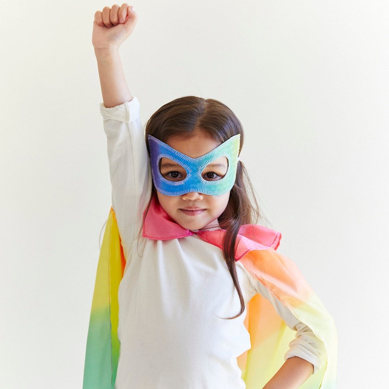 This vibrant rainbow silk mask will provide your child with endless inspiration and enable hours of make-believe play. The perfect addition to any costume, from a fairy princess to a unicorn. The elasticated strap means this mask can fit a variety of ages.