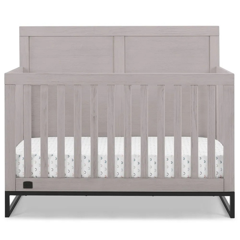 The Foundry 6-in-1 Convertible Crib by Simmons Kids is designed to be a lasting piece of furniture from your childs baby years well into grade school. A true mix of rustic and modern, this baby crib features a softy textured finish thats hand applied and a sleek, matte black metal base.