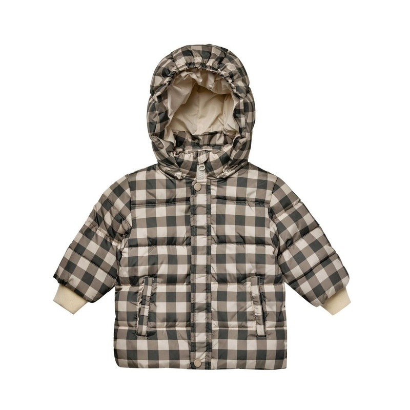 Our puffer jacket includes a hood with and elastic band at the top for a secure fit and a hidden zipper at the front.Featuring our 'sand+black check' all over pattern. Care: Machine wash cold. Hang to dry.Made of 100% Polyester