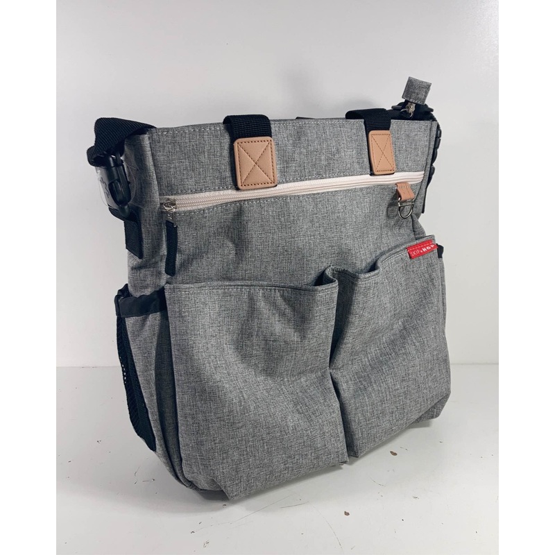 “Spacious diaper bag that keeps all your items organized and easy to find. Features several small outer pockets, one with a zippered closure and two with magnetic button closures. Use the double shoulder straps or one messenger bag strap to comfortably carry your goods. Includes a matching diaper changing pad.”