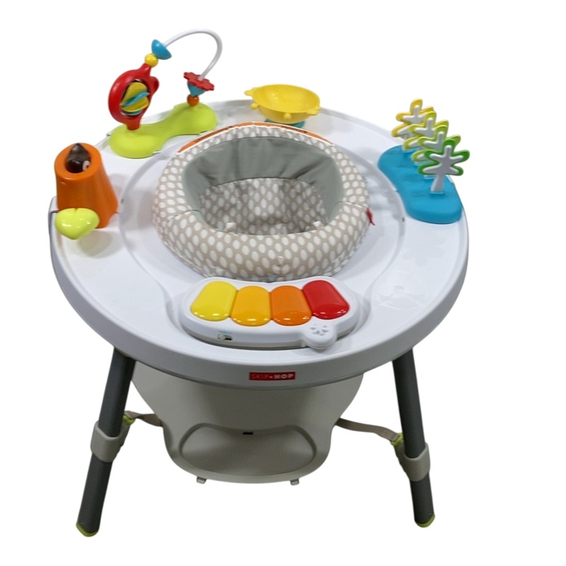 Condition: Gently Used Baby will have a blast bouncing and playing in this engaging saucer. Includes a variety of age appropriate developmental toys to keep your little one happily entertained. When your child grows it turns into a fantastic activity table