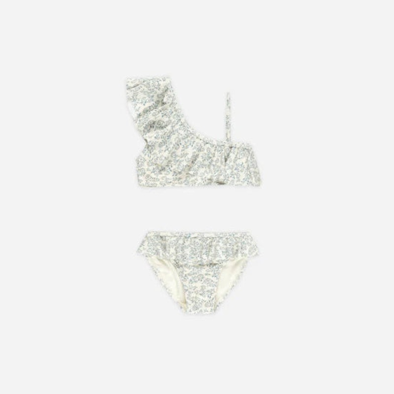 This two-piece bikini set is designed with an asymmetrical ruffle top with spaghetti strap and matching ruffle-skirted bikini bottom.UPF 50+Featuring our blossom print on our ivory hue. This blue floral array is perfect for bright summer days.Care: Machine