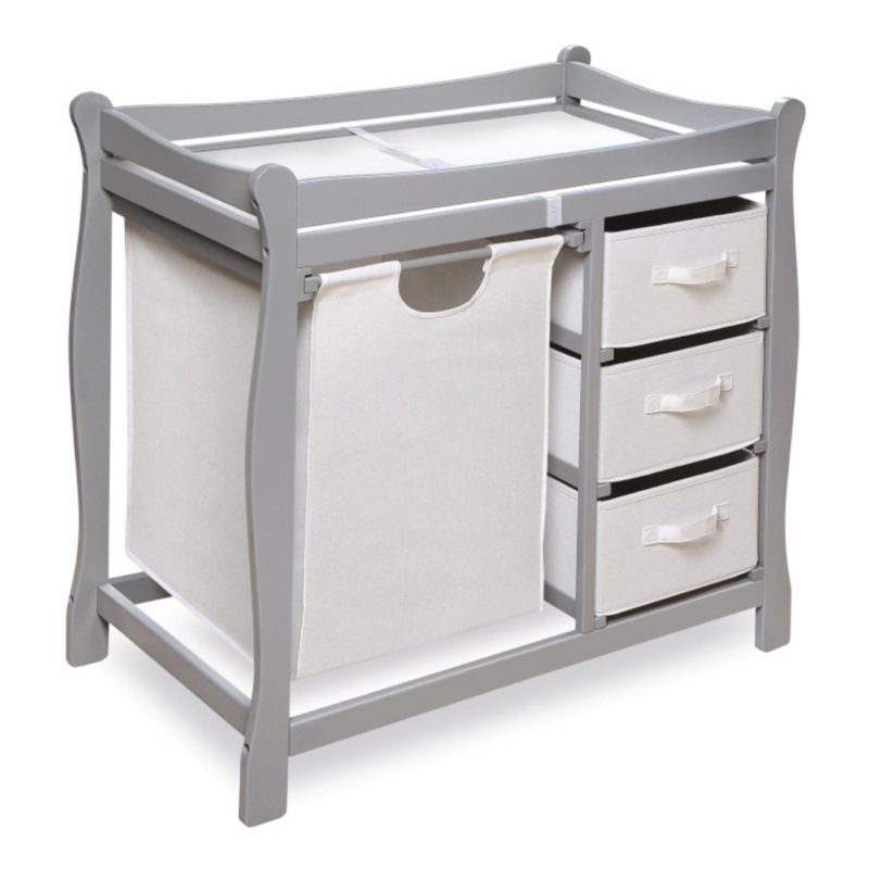 - Ample room for diaper changing on top with storage baskets and a hamper included below